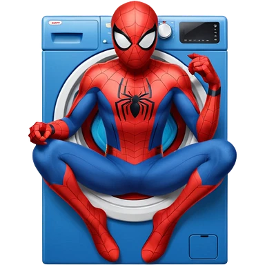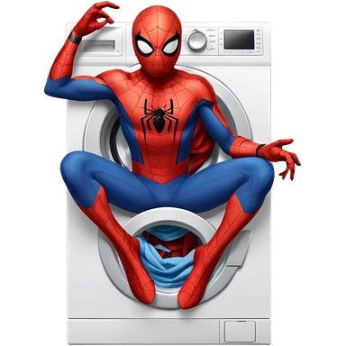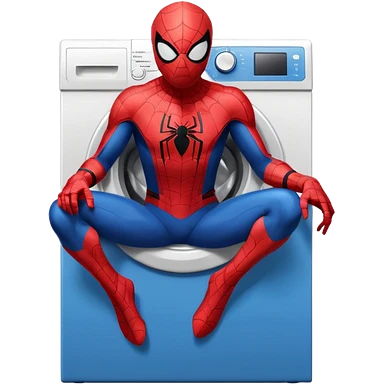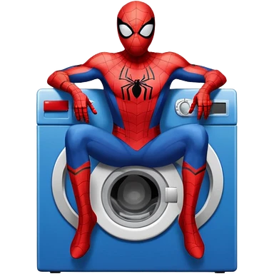 Die-cut sticker of Spider-Man sitting on a washing machine, bold vector art, thick white border, isolated on white background.with 4k resolution emoji