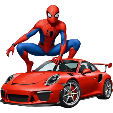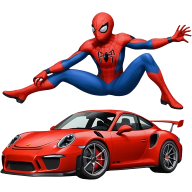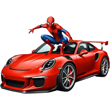 Die-cut sticker of Spider-Man sitting on a Porsche 911 GT3 RS, bold vector art, thick white border, isolated on green hilly background. emoji