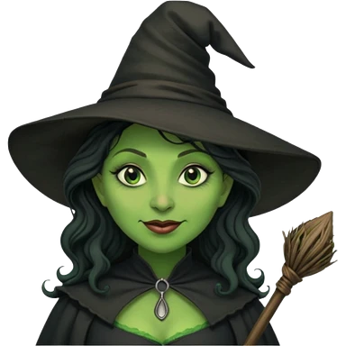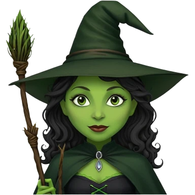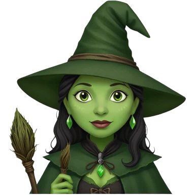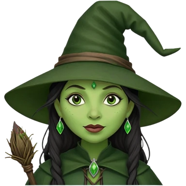 elphaba the wicked witch from wicked movie (cynthia erivo) dark long textured hair, thick lips, green skins, witch hat, witch broom emoji