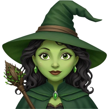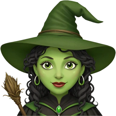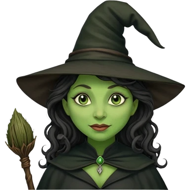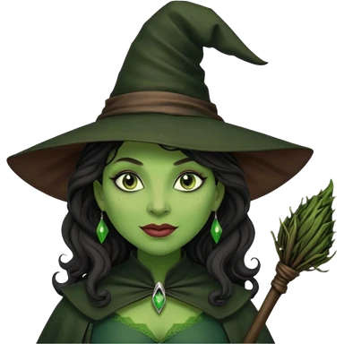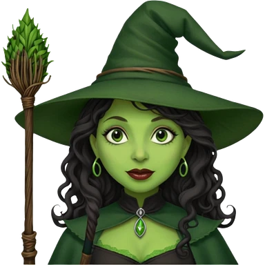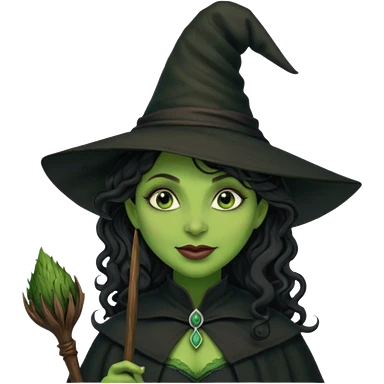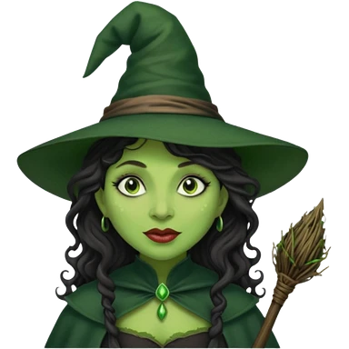 elphaba the wicked witch from wicked movie (cynthia erivo) dark long curly hair, thick lips, green skins, witch hat, witch broom, evil, wicked musical film emoji