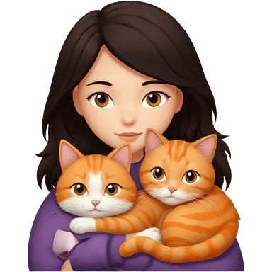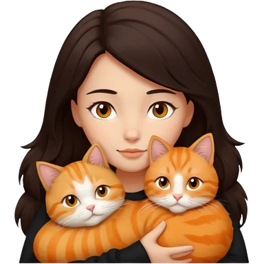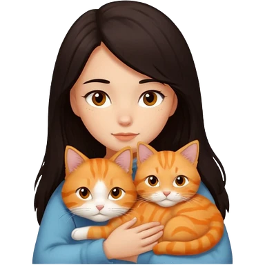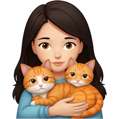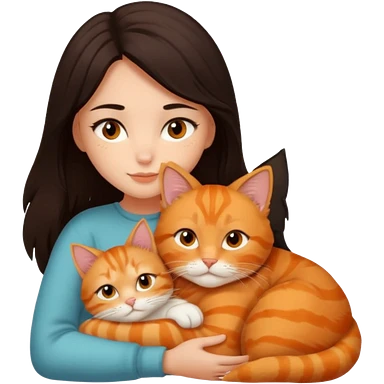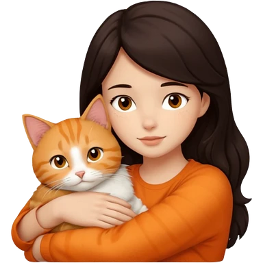 dark-black-brown-hair-to-shoulder girl with brown eyes snuggled with orange tabby cat emoji | AI Emoji Generator