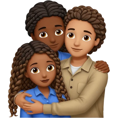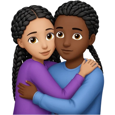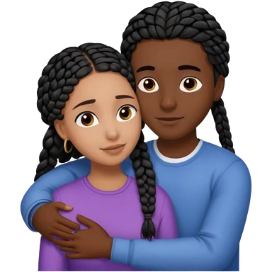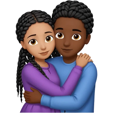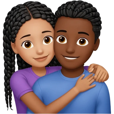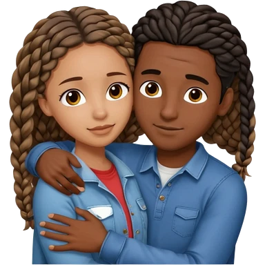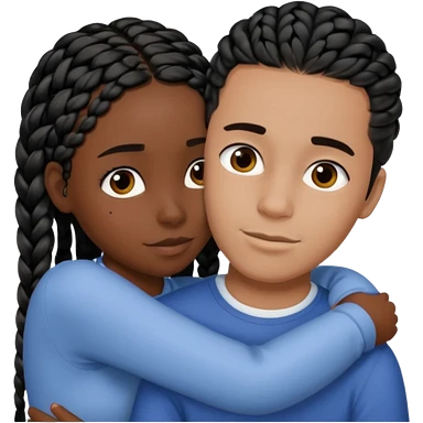 Dark black girl with black braids and tan white boy with curvy straight brown hair, they are hugging and smiling, and touching each other with their hands emoji
