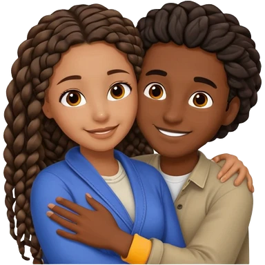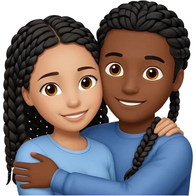 Dark black girl with black braids and dark tan white boy with curvy straight brown hair, they are hugging and smiling, and touching each other with their hands emoji