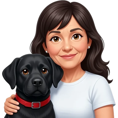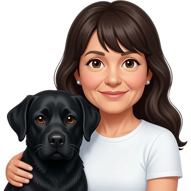 woman, 60s aged, long dark hair with fringe, small diamond earrings, brown eyes, cuddling black labrador with red collar, white t-shirt emoji