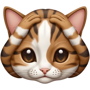dark brown tabby and white small cat in funny positions upside down with paws covering eyes emoji