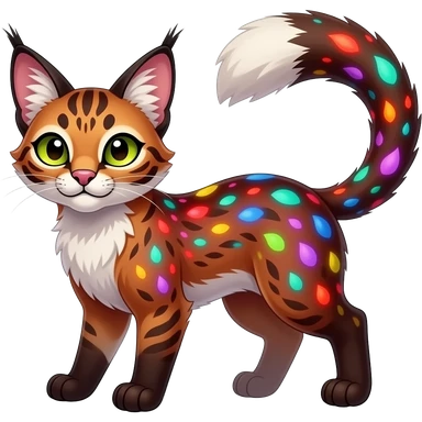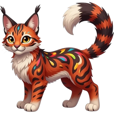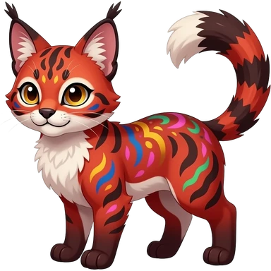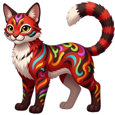 Vibrant-colored red-dark-brownish-furred colorful painted marked patterned Asian glorious divine exotic cute cool beautiful shiny beautiful fantasy-caracal-civet-genet-sergal-vernid-Cacomistle-oncilla-animal-Fakémon-hybrid-fursona (full body) emoji