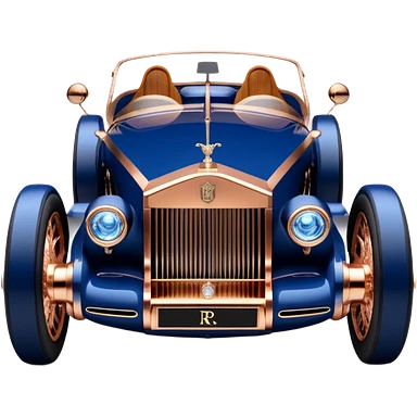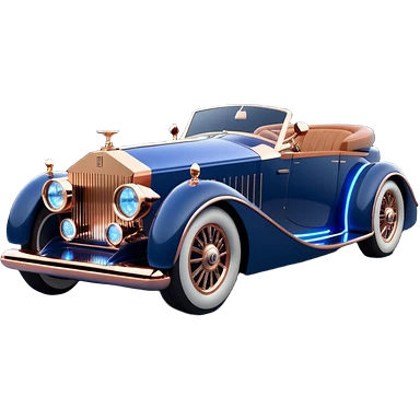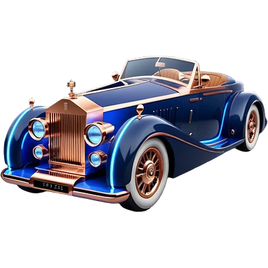 dark blue led lights on a streamlined stripped down hot rodded inlaid rose gold and wood accentuated sporty 1932 Rolls Royce with futuristic electric spaceship plasma neon glowing motors and lightening dynamos with wide racing wheels that are held strong by advanced suspension and steering emoji
