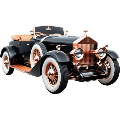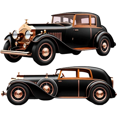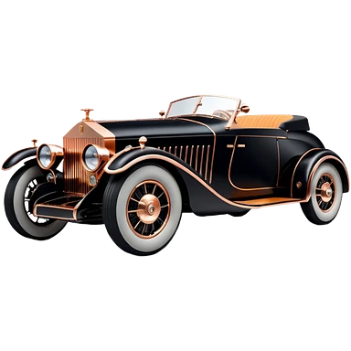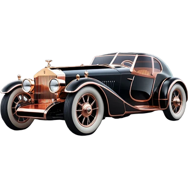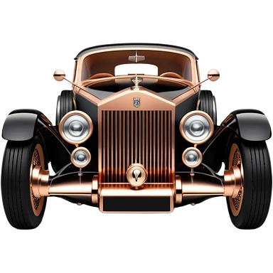 Dark black Bare bones streamlined stripped down hot rodded inlaid rose gold and wood accentuated sporty 1932 Rolls Royce with futuristic electric spaceship plasma neon glowing motors and lightening dynamos with wide racing wheels that are held strong by advanced suspension and steering emoji