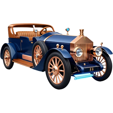 dark blue led lights on a hot rodded delicately inlaid rose gold and wood accentuated sporty 1889 Rolls Royce with futuristic electric spaceship plasma motors and dynamos with wide racing wheels that are held strong by advanced suspension and steering emoji