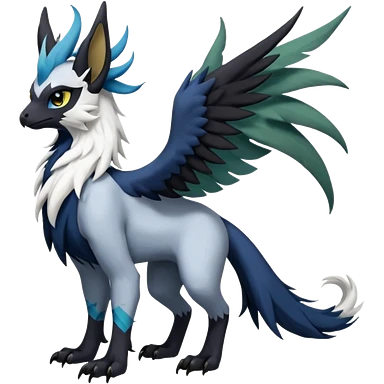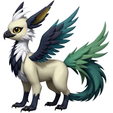 Dark-deep-colored gryphon-Trico-Nargacuga-Absol-Leafeon-Sprigatito-Silvally-fusion-hybrid with a long tufted tail, black beak, black claws, black tail, majestic, realistic, furry (full body) emoji | AI Emoji Generator