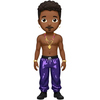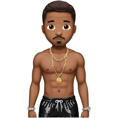 Stevie J, Record Producer with dark brown hair, black sequin baggy pants, shirtless with necklace emoji
