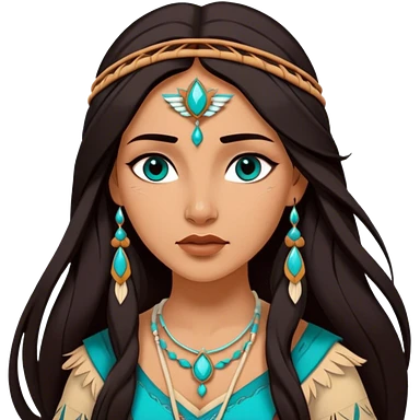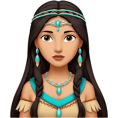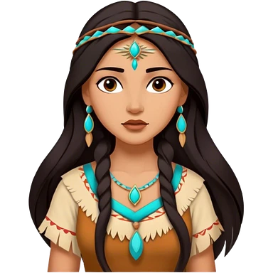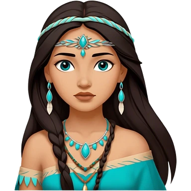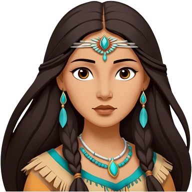 Cinematic Realistic Elegant Pocahontas Portrait, depicted with sun-kissed, warm skin rendered in lifelike detail and soft, natural lighting that accentuates its gentle glow. Her long, flowing dark hair is intricately detailed with natural movement, and her wise, expressive eyes shine with a deep, serene intensity. She is dressed in traditional attire with rich earthy tones and subtle turquoise accents, each fabric fold and texture rendered authentically. The portrait exudes a natural radiance that captures the timeless, indigenous beauty of Pocahontas with depth and authenticity. emoji