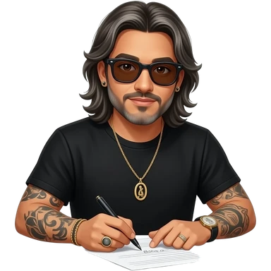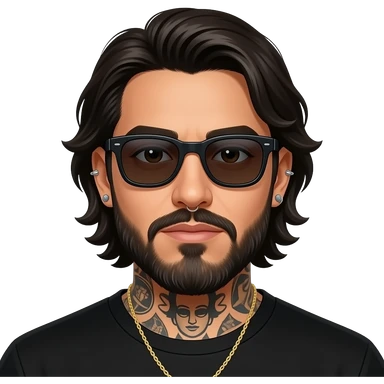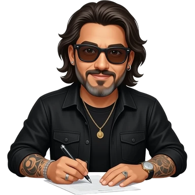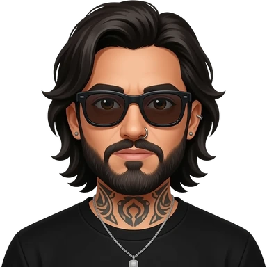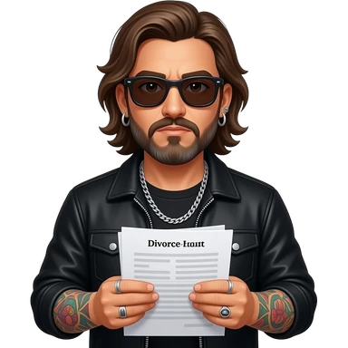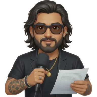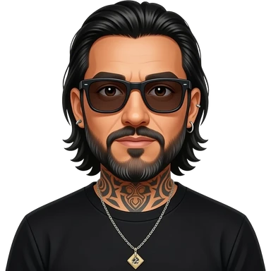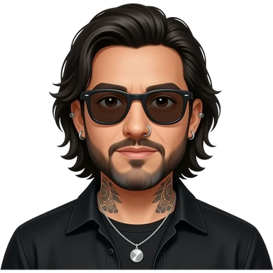 The handsome manly Latino podcast host with medium length hair, a long slightly graying beard and tattoos with his ears pierced 1 time each ear and a nose ring on the right side, dark brown eyes, wearing black, super dark sunglasses, jewelry, getting a divorce emoji