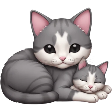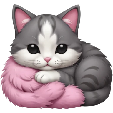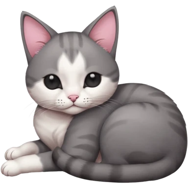 dark grey and white small cat with closed eyes, leaning his head on his paw while leaning on his elbow lying down emoji | AI Emoji Generator