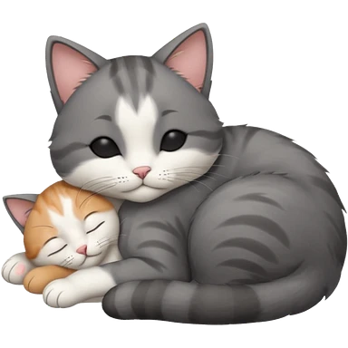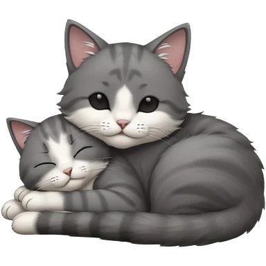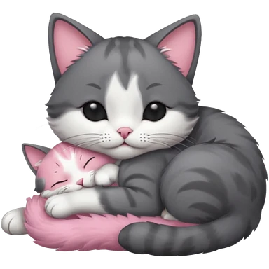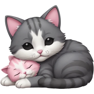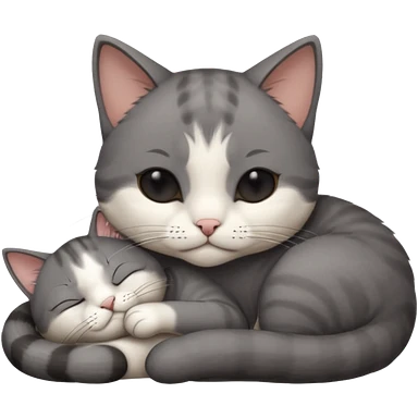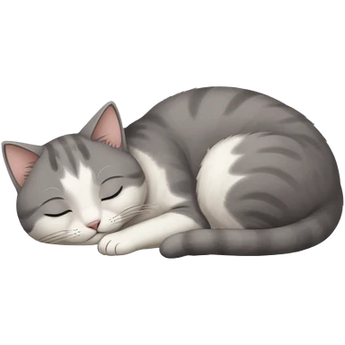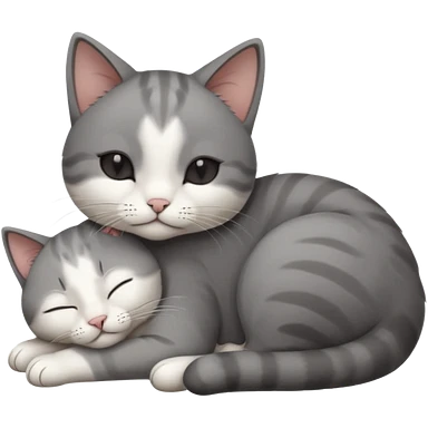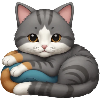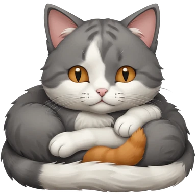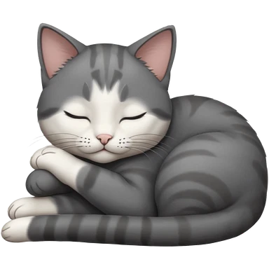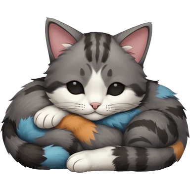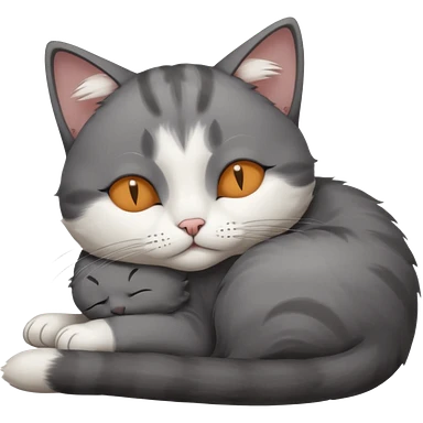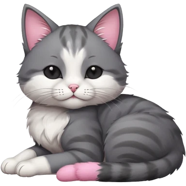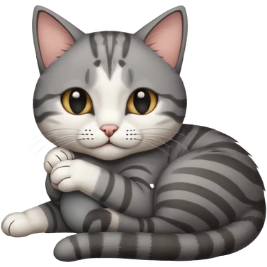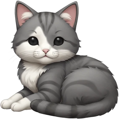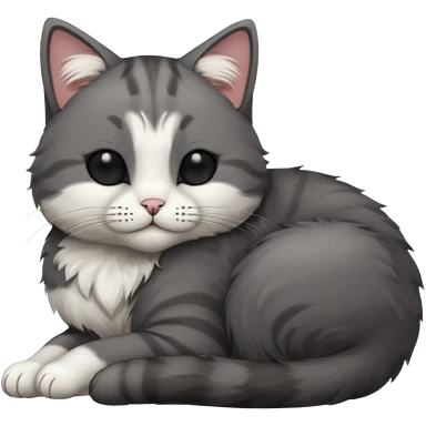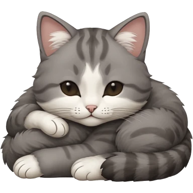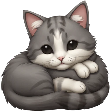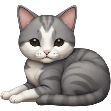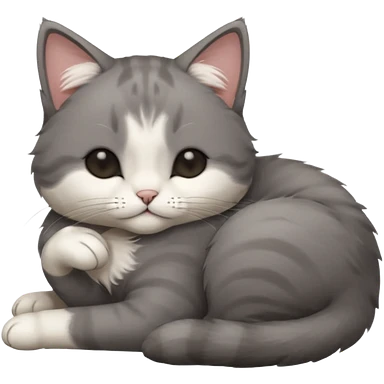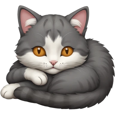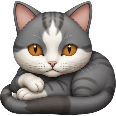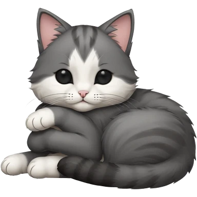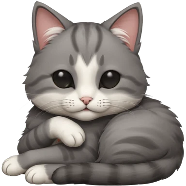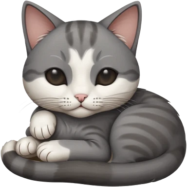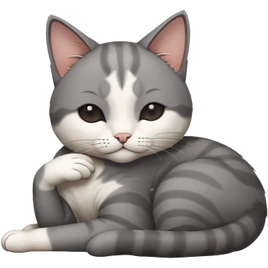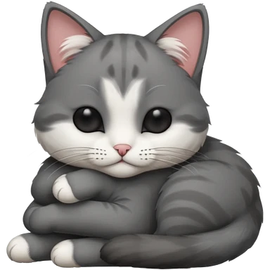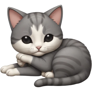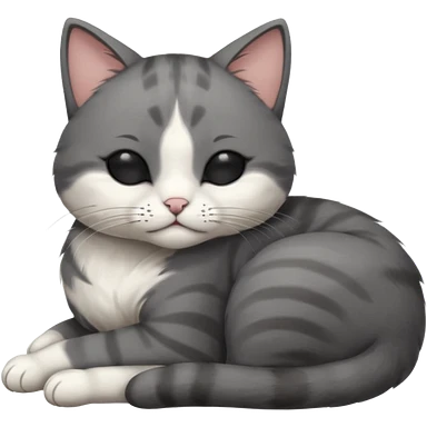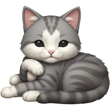 dark grey and white small cat with his eyes closed leaning his head on his paw while leaning on his elbow lying down emoji | AI Emoji Generator