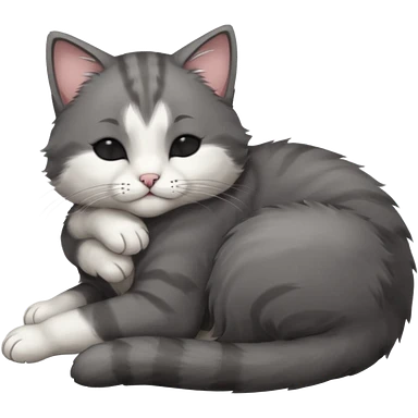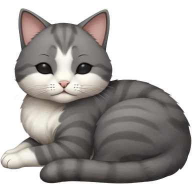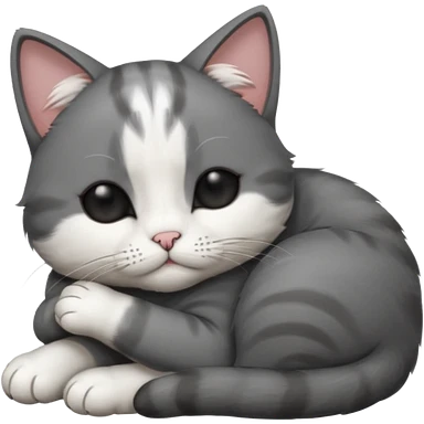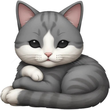 dark grey and white small cat with his eyes closed leaning his head on his paw while lying down emoji