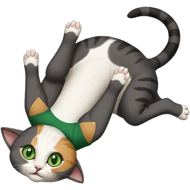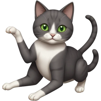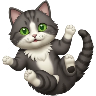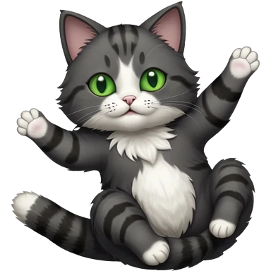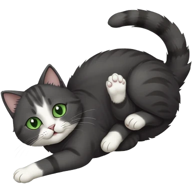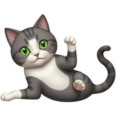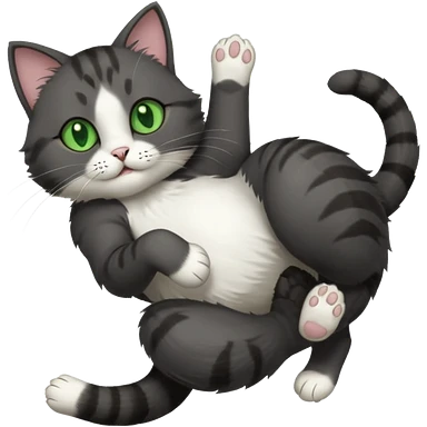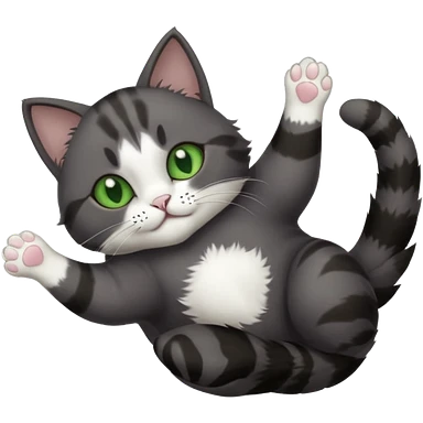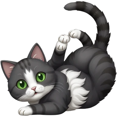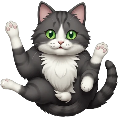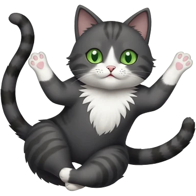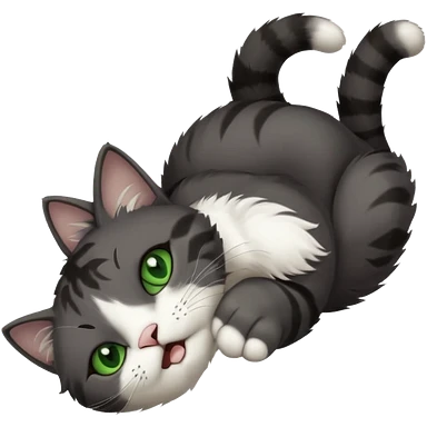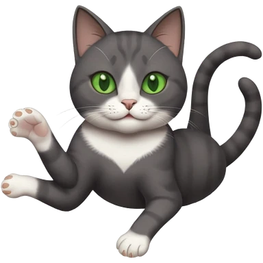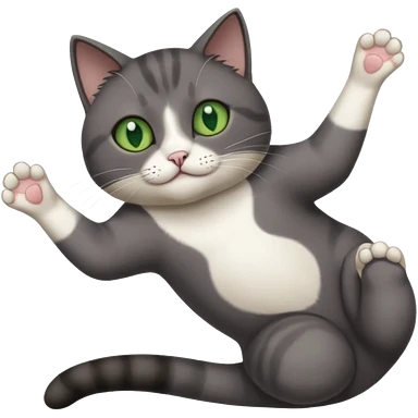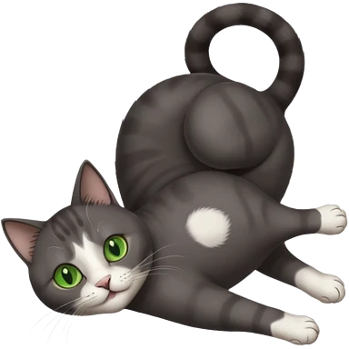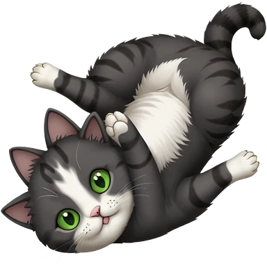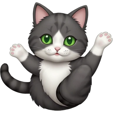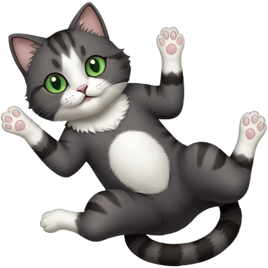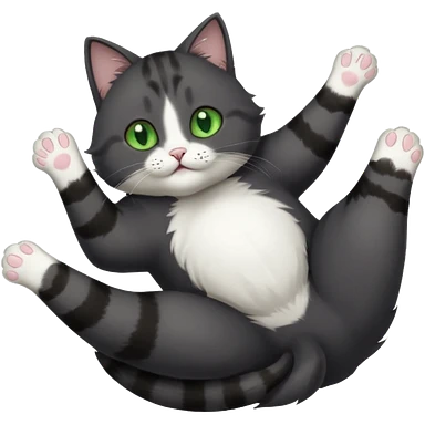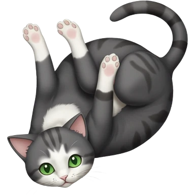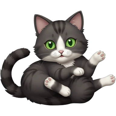 dark grey cat with green eyes, white toes/paws and white patch on her chest playfully rolling upside down emoji