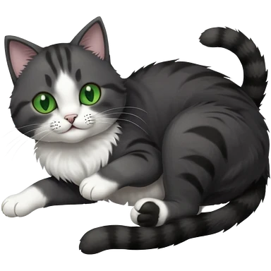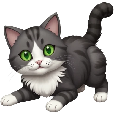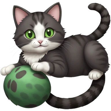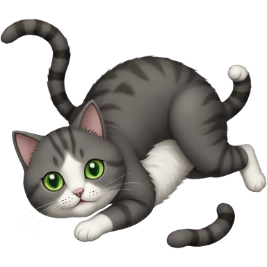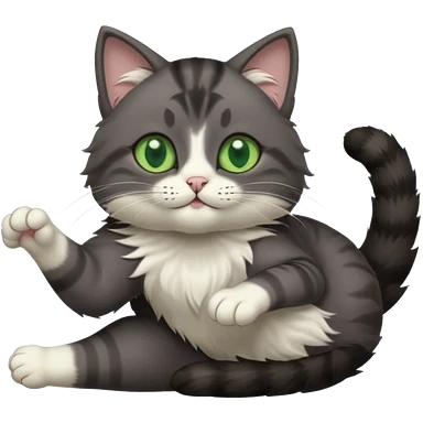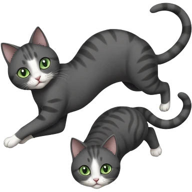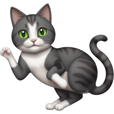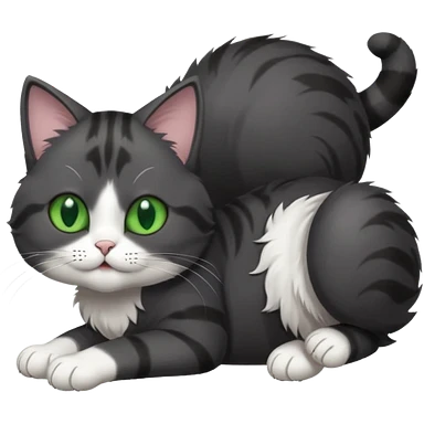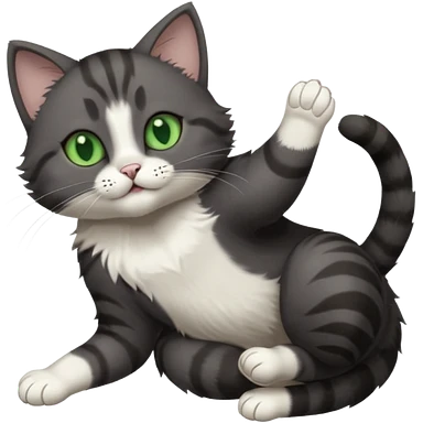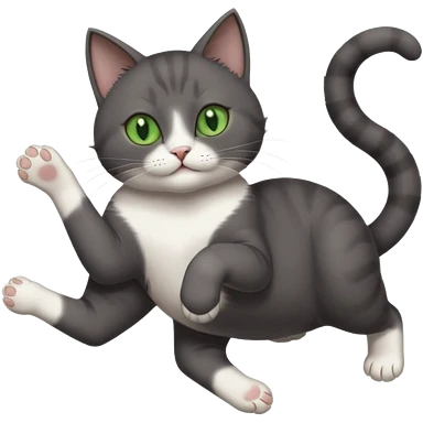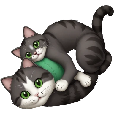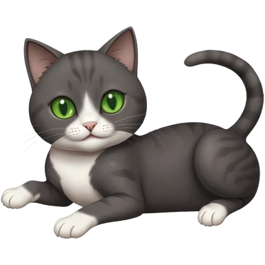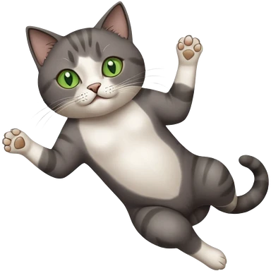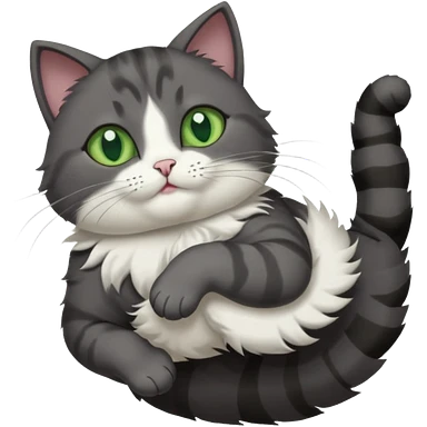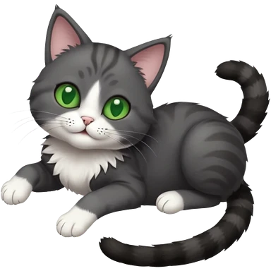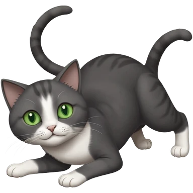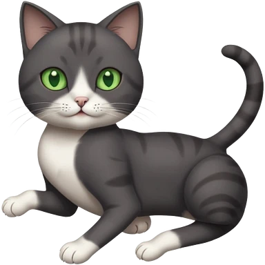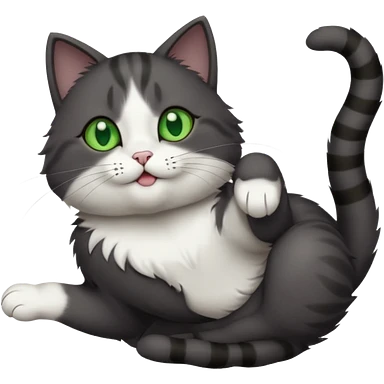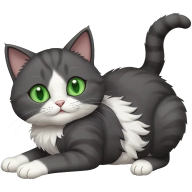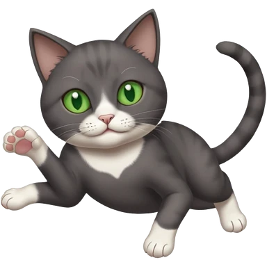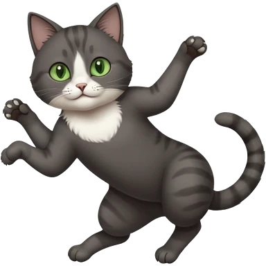dark grey cat with green eyes, white toes/paws and white patch on her chest playfully rolling upside down emoji