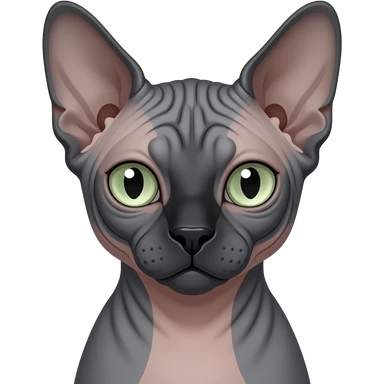 Dark grey female sphynx cat with black nose and light green eyes, just the face, emoji, wrinkles, cure, adoreable emoji | AI Emoji Generator