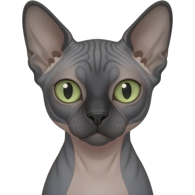 Dark grey female sphynx cat with black nose and light green eyes, just the face, emoji, wrinkles emoji