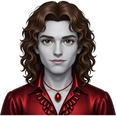 Nicolas from The Vampire Chronicles with pale-grey skin, dark brown eyes, long curly chestnut brown hair, blood red metallic ruffle shirt, red necklace emoji