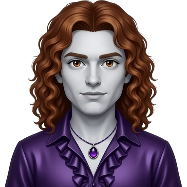 Armand from The Vampire Chronicles with pale-grey skin, dark brown eyes, long auburn curly hair, dark purple metallic ruffle shirt, purple necklace emoji