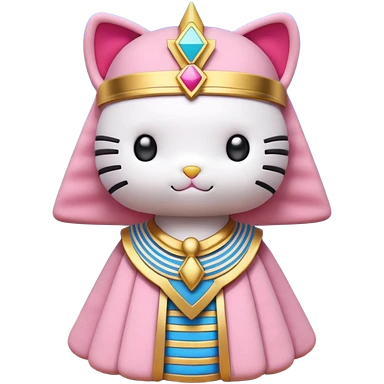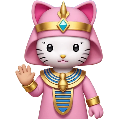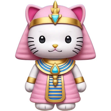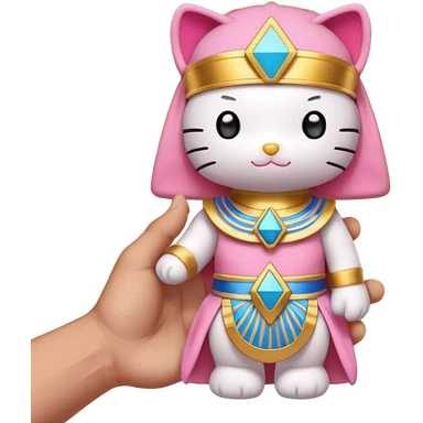 a Hello Kitty–style plush dressed as an Egyptian pharaoh, held by a hand, with a pyramid in the desert background, clear blue sky, natural light, shallow depth of field. emoji