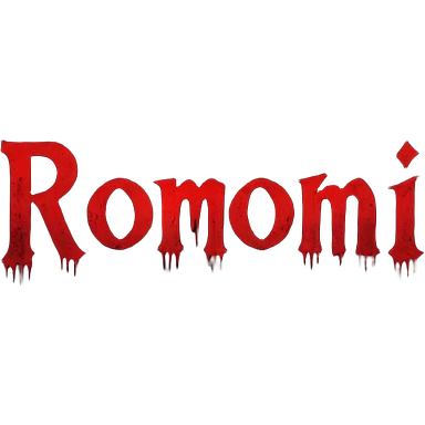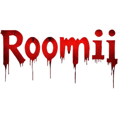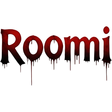 Dark horror cinematic wallpaper foggy grey and charcoal background with subtle pale light from top-left, cinematic grain and vignette, scattered floating dust particles , centered bold text "ROJONI" in distressed horror font with faint red smear and inner shadow, moody emoji