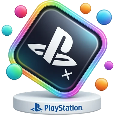 Square tilted 45 degrees game icon, dark glossy surface, large white PlayStation symbols triangle circle square cross centered, holographic rainbow glowing border edge, RGB colored discs floating around, white base stand below, PlayStation logo at bottom, dramatic light ray top right emoji