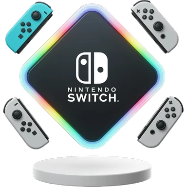 Square diamond tilted 45 degrees, dark surface, Nintendo Switch symbols centered, pastel rainbow glowing edges, floating joy-con controllers around, white dock stand below, black background, 3D render, 1:1 emoji