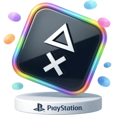 Square tilted 45 degrees game icon, dark glossy surface, large white PlayStation symbols triangle circle square cross centered, holographic rainbow glowing border edge, RGB colored emoji