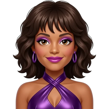 Dana from Bratz with blue eyes, long dark brown hair, purple eyeshadow, gold lipstick, purple metallic halter dress, lilac earrings emoji