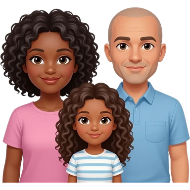 Dark mother with curly bohn and girl with curly locks and bald father lightskin with emoji
