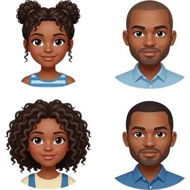 Dark mother with curly messy bun and teenage girl with curly locks and bald father brownskin with emoji