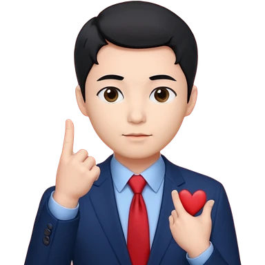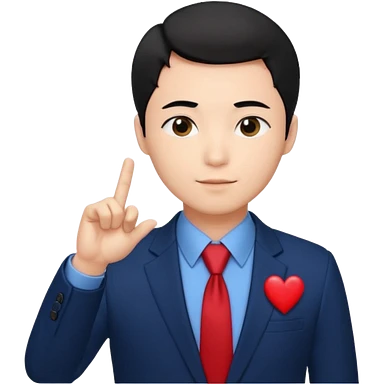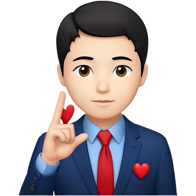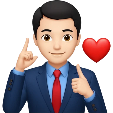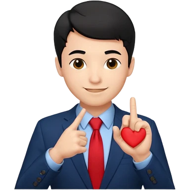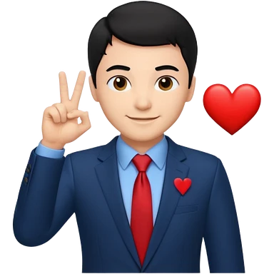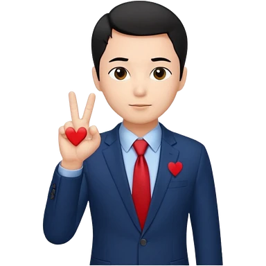A man in very black short hair with all back hair style, wearing dark blue suit and red tie, making a heart finger emoji