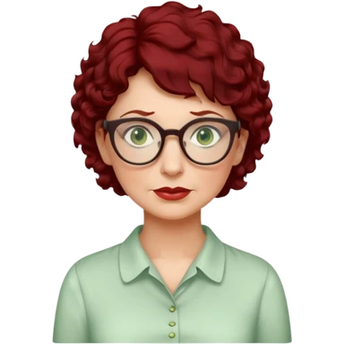 create an emoji of an adult woman with wrinkles and glasses, she has extremely short curly dark red hair, green eyes and a pale white vintage blouse emoji