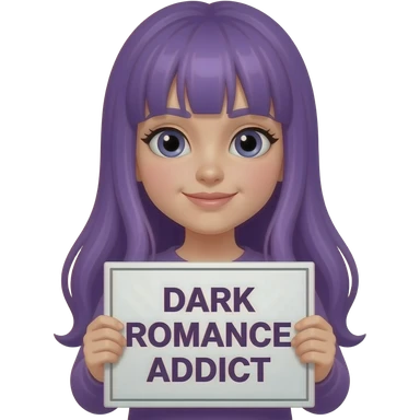 girl with long purple hair holding a DARK ROMANCE ADDICT sign emoji