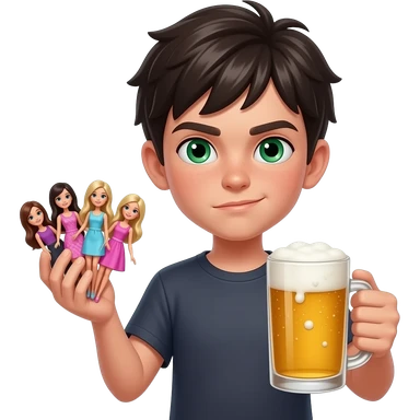 Little slim dark haïr boy with green eyes very arrogant with a cigar, there barbies in one hand and a beer in another emoji