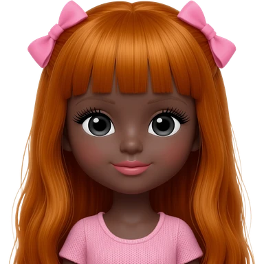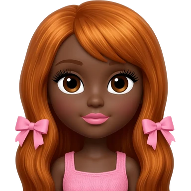 Doll with darkbrown skin with long ginger hair with pink bows, lashes, cute lips emoji