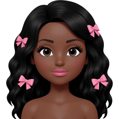 Doll with darkbrown skin with long black wavy hair with pink bows, lashes, cute lips emoji
