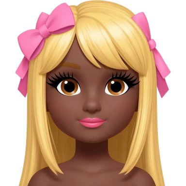 Doll with darkbrown skin with long blonde hair with pink bows, lashes, cute lips emoji