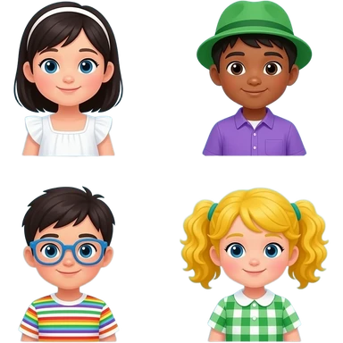 Central hosptial stories five kids One Girl With Light Skin With Asian Hair And white dress One Boy With Dark Skin And Normal Hair With Purple Shirt And Green Hat One little boy with autism glasses and Rainbow lines shirt One Big girl with yellow curly ponytails and Green Squares collar dress emoji