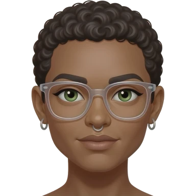 De ella solo se muestra desde el cuello para arriba. Es de piel morena y de estilo 3d. Tiene arito en cada oreja. Tiene un pequeño piercing en un costado del labio.Tiene lentes tranparentes. Tiene ojos verdes claro con cejas poquito frunzidos. emoji | AI Emoji Generator