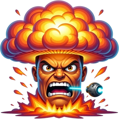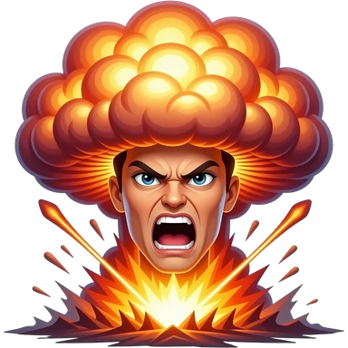 emoji, angry teen face, eyes shooting laser beams, nuclear mushroom cloud explosion in background, flat cartoon, vivid red orange yellow, clean outlines, white background emoji