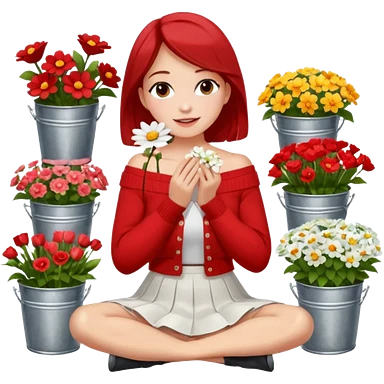 a woman sitting on a tiled surface surrounded by various bouquets of flowers in metal buckets and glass vases. She is holding a single white flower up to her face, covering it playfully. She wears a red off-shoulder cardigan and a white skirt. emoji