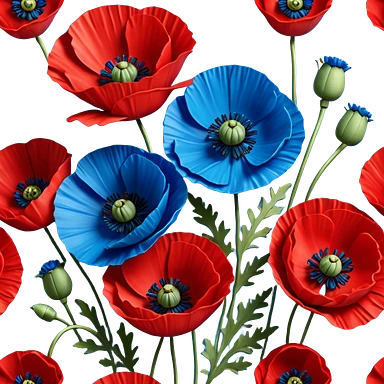 Still life realistic 3D rendering, bright blue and red poppies emoji