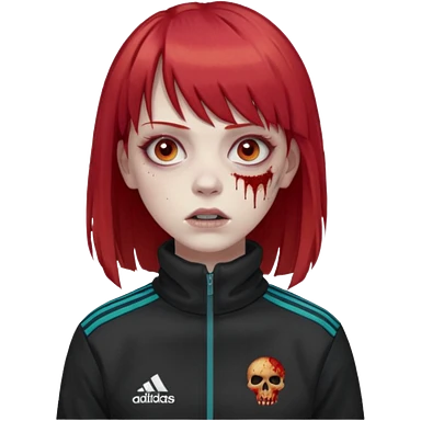 Crie um emoji de uma menina com bochecha gordinha com o cabelo vermelho longo com uma franja reta zumbi casaco de gola alta da adidas emoji