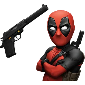 Deadpool in classic red and black suit, holding katanas, playful expression emoji