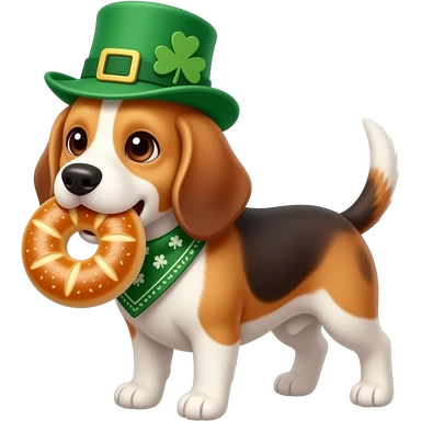 Beagle dressed for St Patrick’s day with bagel in its mouth emoji
