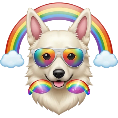 White belgian Shepard with glitter sunglas , on a rainbow emoji